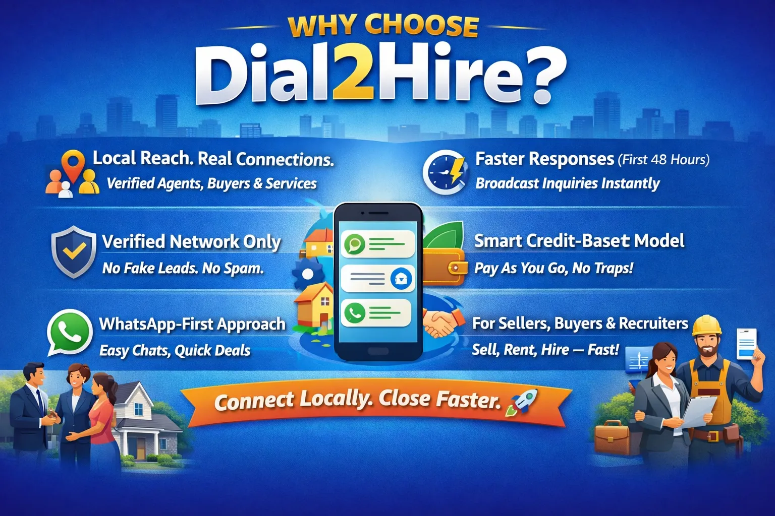 Local reach that delivers results. Your listing is instantly shared with verified agents and buyers active near your property. Verified network only. No spam, no fake inquiries—just genuine, pre-checked professionals. Speed matters. Capture serious interest in the crucial first 48 hours with instant broadcasts. Pay once, stay in control. Simple credit system. No auto-renewals. No hidden charges. Smart contact unlocks. Unlock only when needed, track responses, manage everything from your dashboard. Built for real action. Sell, rent, or generate leads faster—beyond just listing and waiting. Direct WhatsApp & SMS reach. One click. Multiple local replies. Zero follow-up stress.